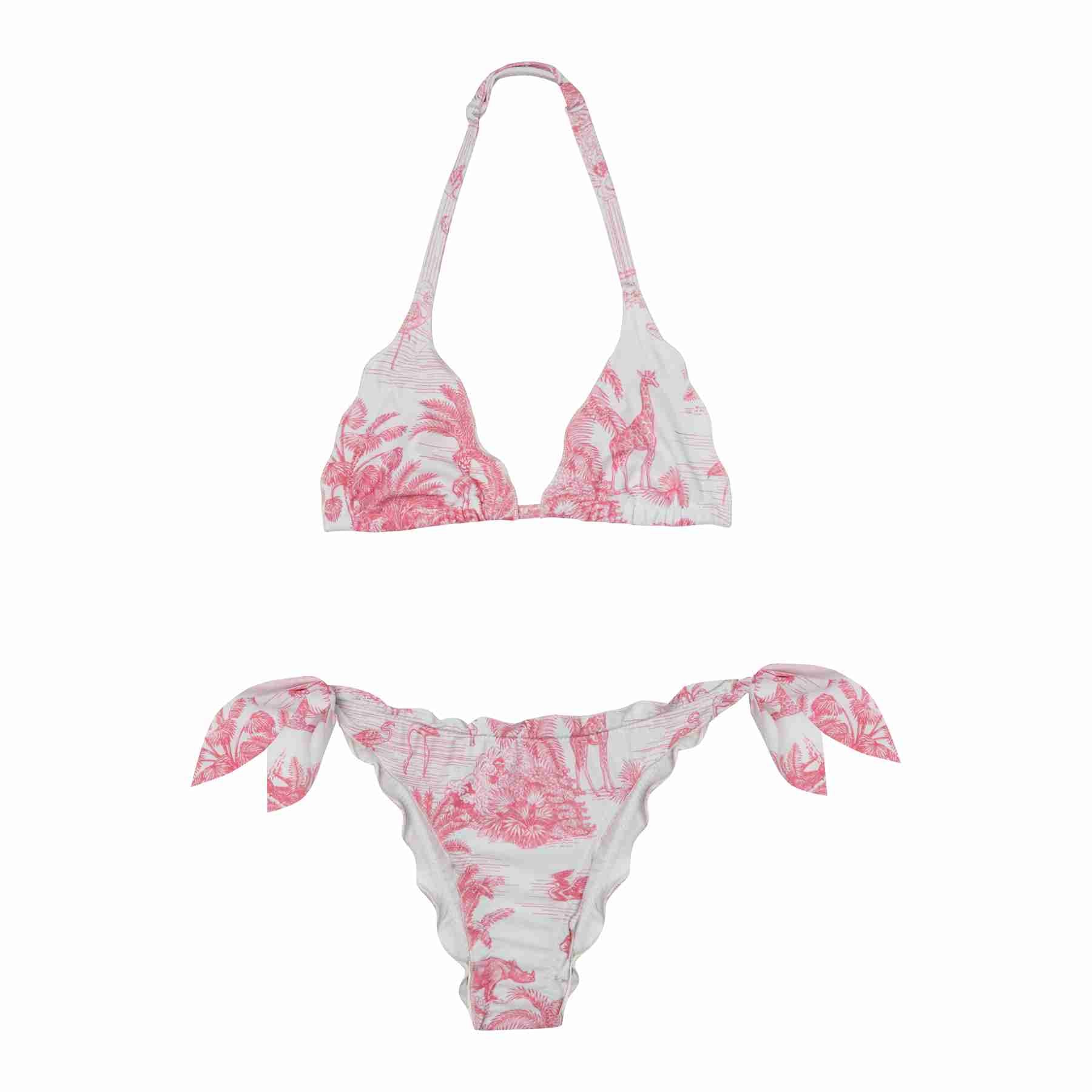 Embrace playful elegance with the Frou Frou Bikini in Jungle Pink. Designed to flatter and stand out, this two-piece set features a delicate ruffled (frou frou) finish combined with a vibrant jungle-inspired print in soft pink tones.The triangle top offers adjustable straps for a customizable fit, while the matching bottom is detailed with feminine side ties and subtle ruffle edges, enhancing your silhouette with a romantic touch. The lightweight, high-quality fabric ensures comfort, flexibility, and a smooth feel against the skin—perfect for sun-soaked days by the beach or pool.Chic, fun, and effortlessly stylish, this bikini is your go-to piece for a fresh summer look.
