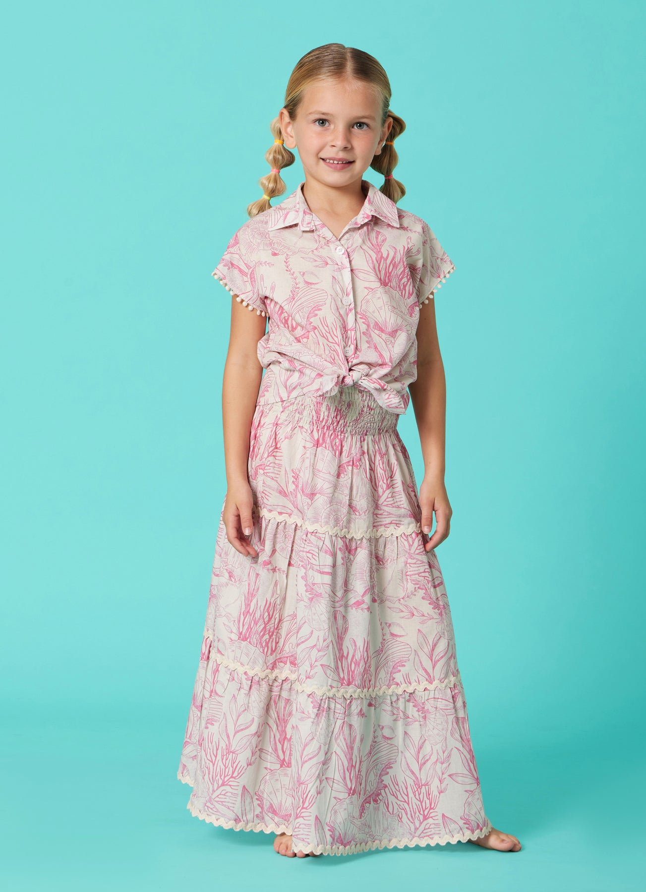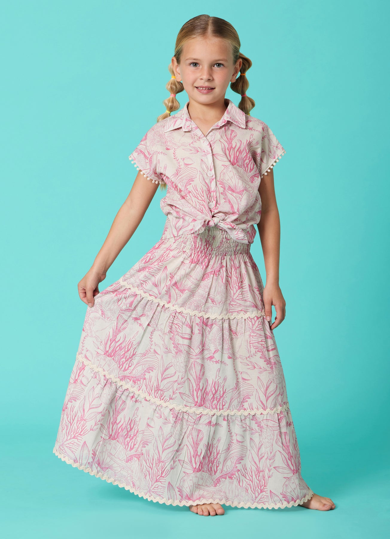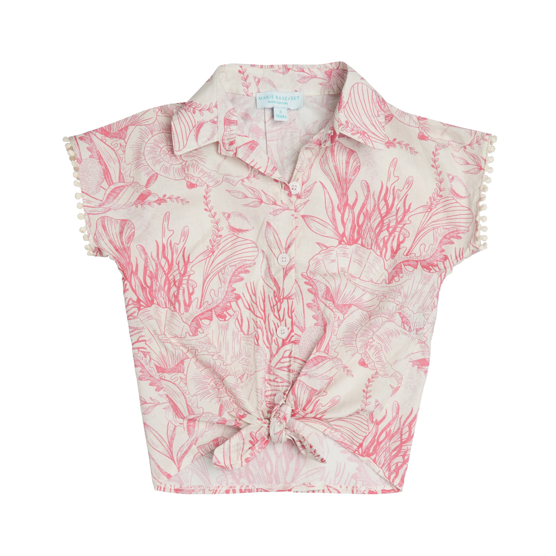 The Thalassa Pink Cotton Shirt is a charming and breathable summer essential, crafted from 100% cotton for maximum comfort and softness on the skin. Its lightweight feel makes it ideal for warm-weather wear.Featuring a delicate pink marine-inspired print, this short-sleeve shirt combines playful elegance with everyday practicality. The classic collar and button-down front add a timeless touch, while the front tie detail creates a relaxed, modern silhouette. Decorative trims on the sleeves enhance its feminine character.Perfect for pairing with skirts, shorts, or coordinated sets, this piece is designed for effortless summer styling.
