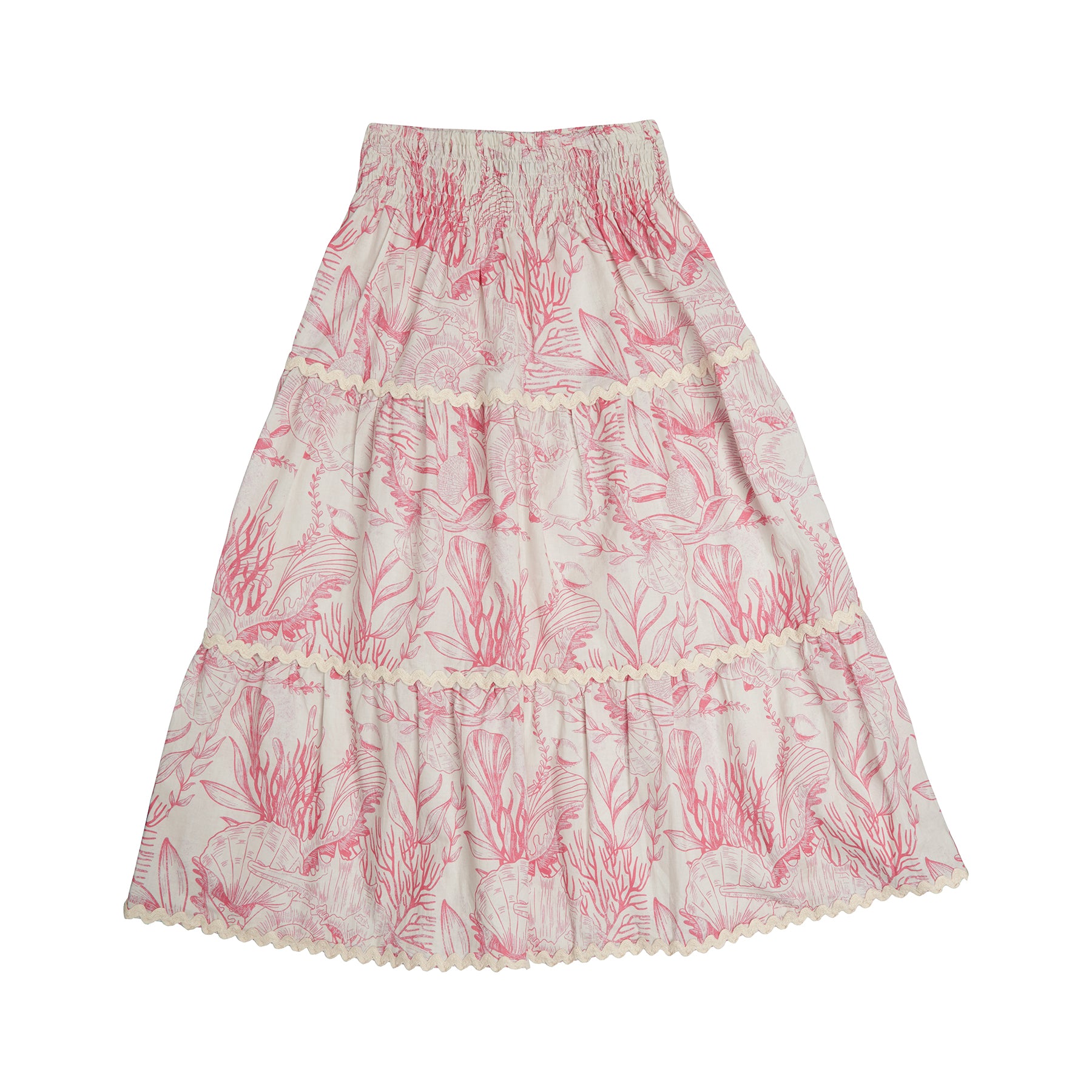 The Thalassa Pink Cotton Skirt is a breezy and elegant piece designed for comfort and effortless summer style. Made from 100% cotton, it offers a soft, breathable feel that keeps you cool throughout the day.Featuring the same delicate pink marine-inspired print, this long skirt stands out with its flowing silhouette and romantic aesthetic. The elasticated waistband ensures a comfortable and flexible fit, while the tiered design adds volume and movement. Subtle decorative trims enhance its feminine and playful look.Perfect for pairing with the matching Thalassa Pink Shirt or a simple top, this skirt is ideal for warm-weather outings, vacations, or everyday wear.