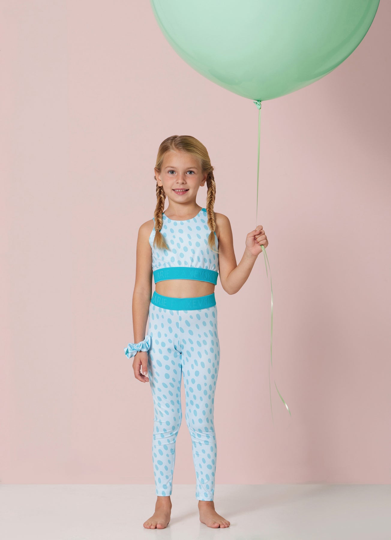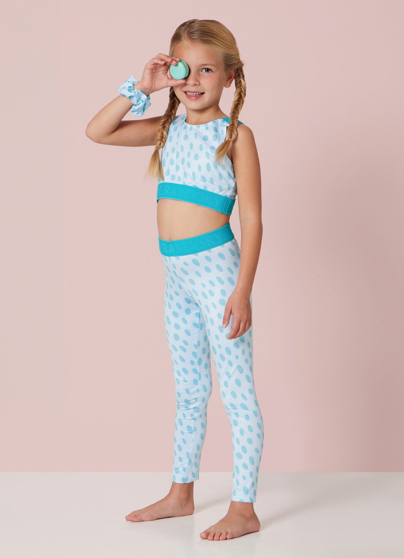 These playful and comfortable kids’ leggings come in a soft light blue shade with an all-over aqua drops print. Made from a stretchy, breathable fabric, they offer a snug yet flexible fit for all day movement. The high, elastic waistband provides secure support, making them perfect for everyday wear, dance class, or active play. Pair them with the matching top for a fun and stylish coordinated look.
