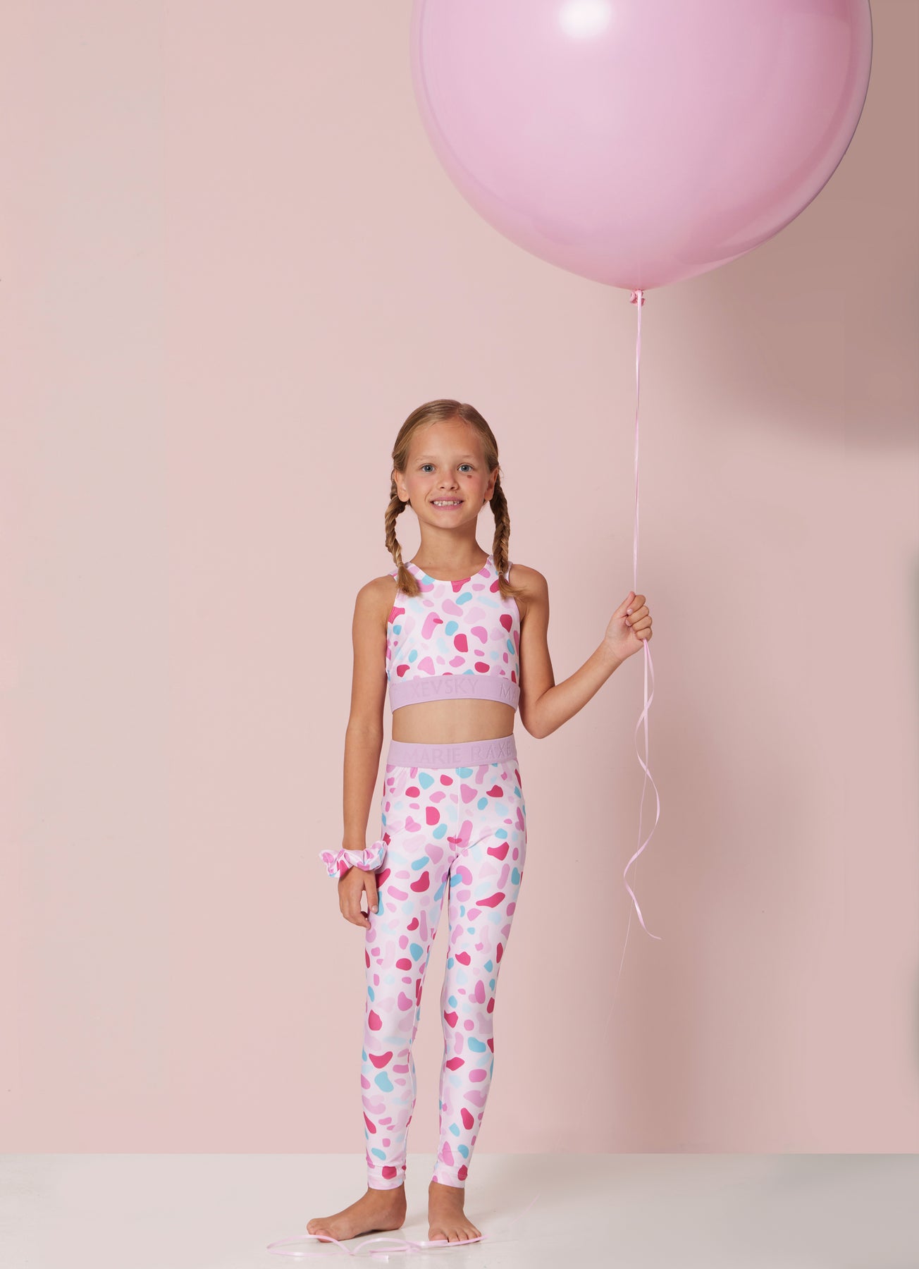 This adorable kids’ active top features a lively confetti drops print in pink, lilac, and aqua tones. Made from a soft, stretchy performance fabric, it offers excellent comfort and freedom of movement for active days. The wide elastic band provides a secure and supportive fit, while the smooth, breathable material ensures all-day wearability. Perfect for dance, gymnastics, playtime, or pairing with the matching leggings for a complete coordinated outfit.