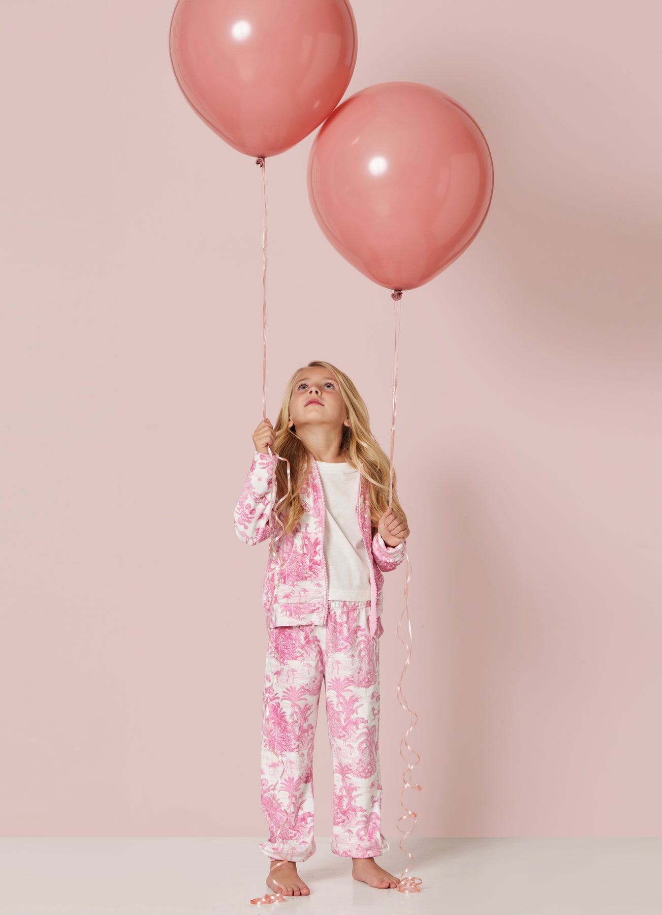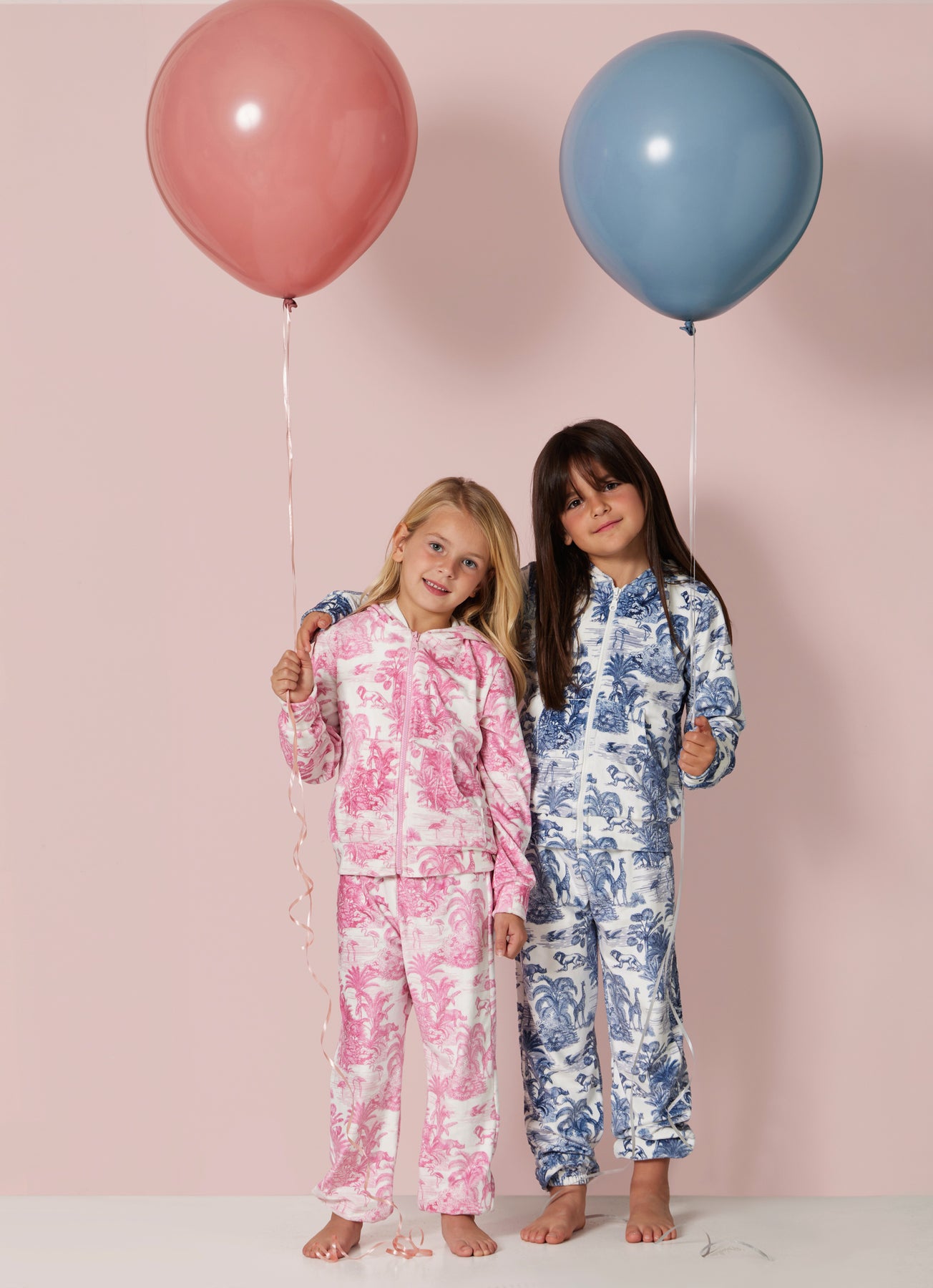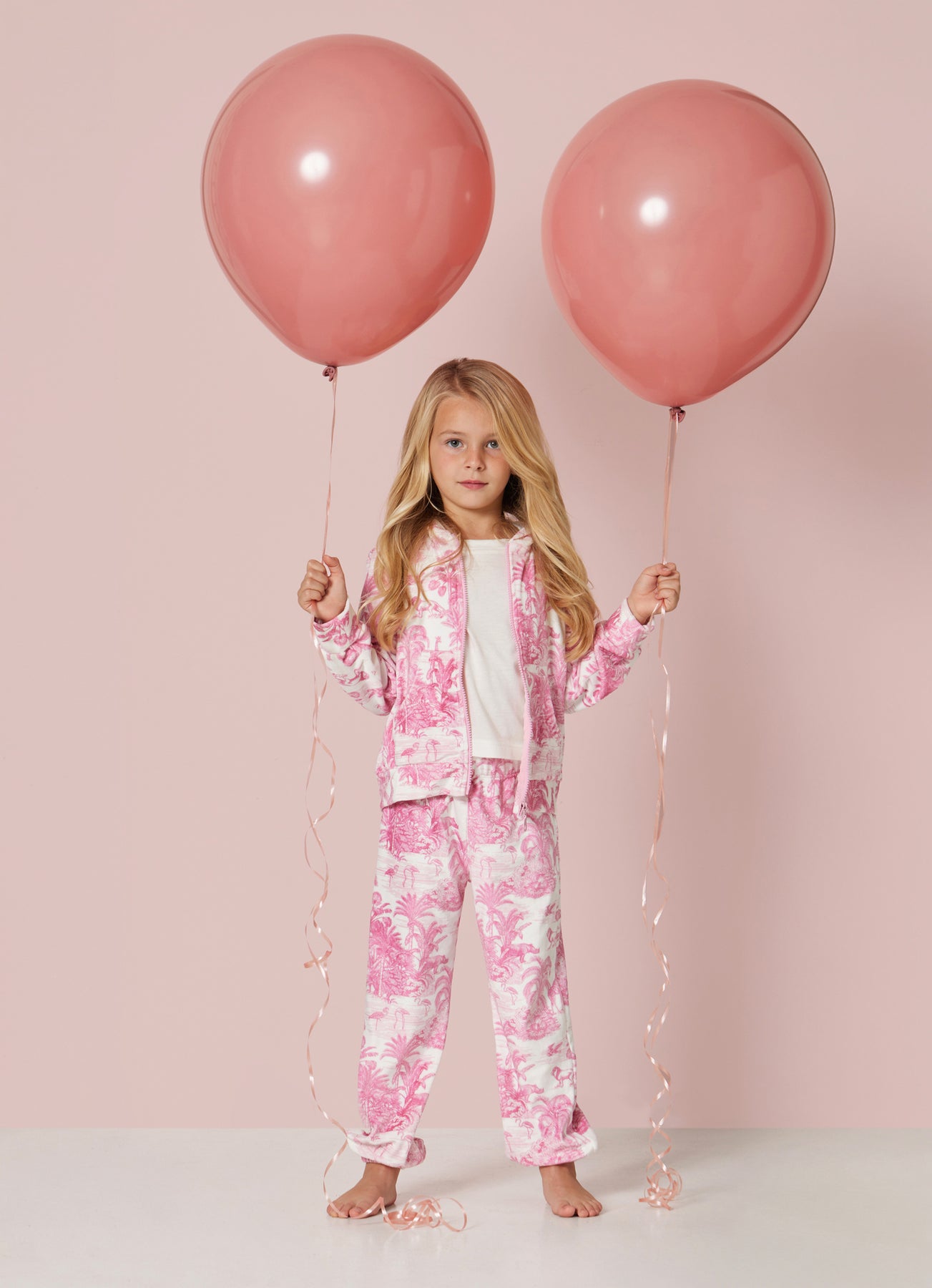 This soft velour tracksuit is designed for effortless comfort and standout style. Featuring a dreamy pink and white jungle pink print. The plus velour fabric offers a gentle, luxurious touch, while the relaxed fit makes it perfect for every day wear. Paired with a simple white top, it creates a fresh, elegant look that kids will love to wear.