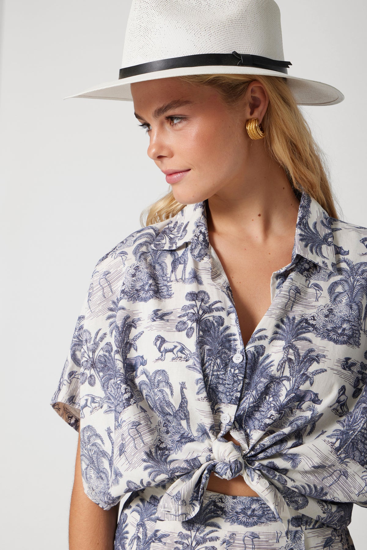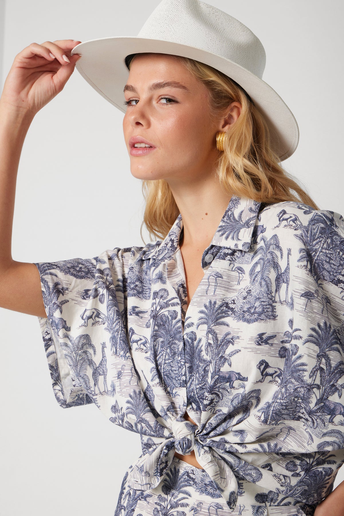This lightweight linen shirt features a relaxed, oversized fit and a stunning blue jungle print that brings a fresh, summery vibe. Designed with short wide sleeves and a classic button down front, it offers effortless comfort and breezy elegance. Made from breathable linen, it’s perfect for warm days and easy to style with matching shorts or your favorite summer basics for a chic, resort inspired look.
