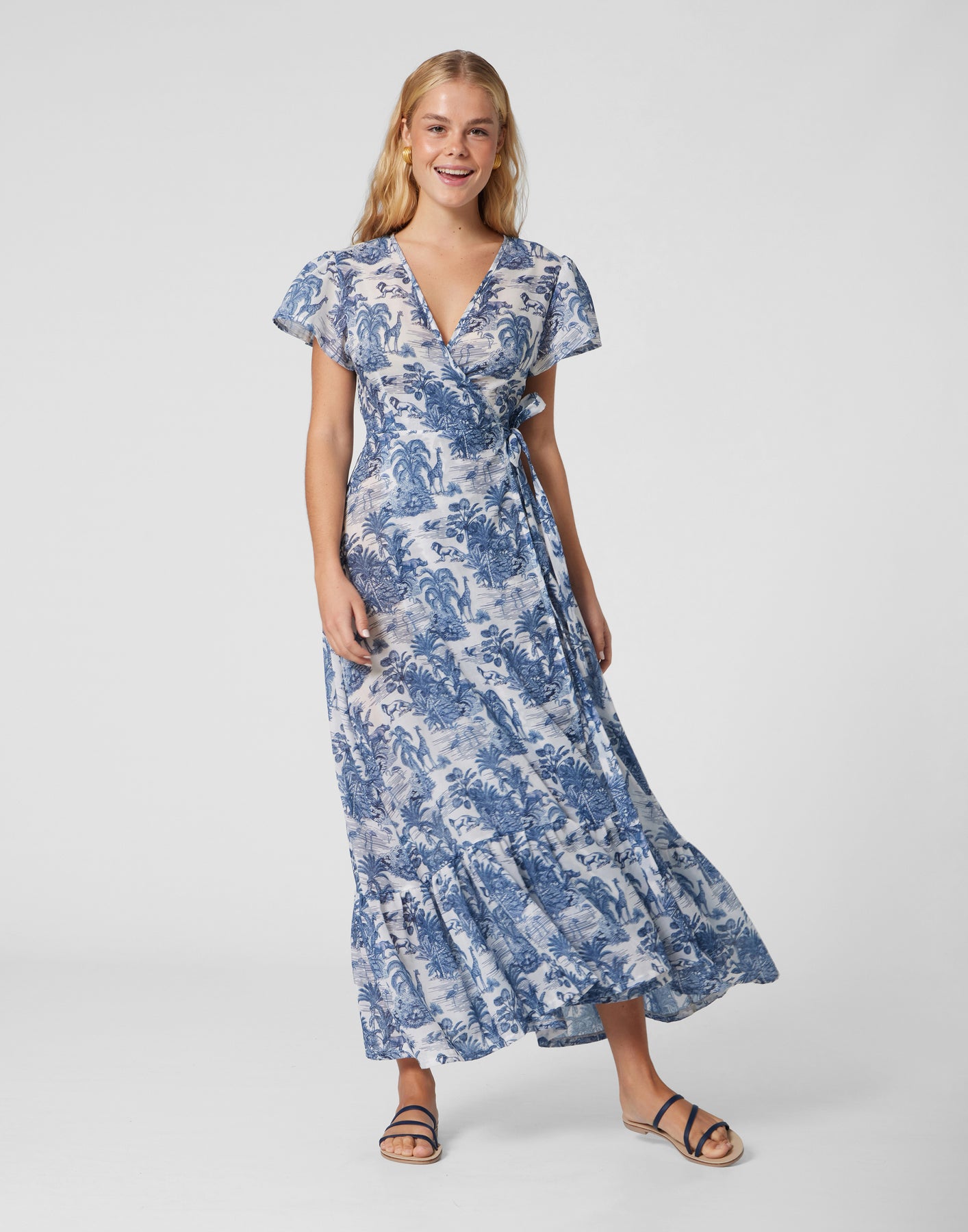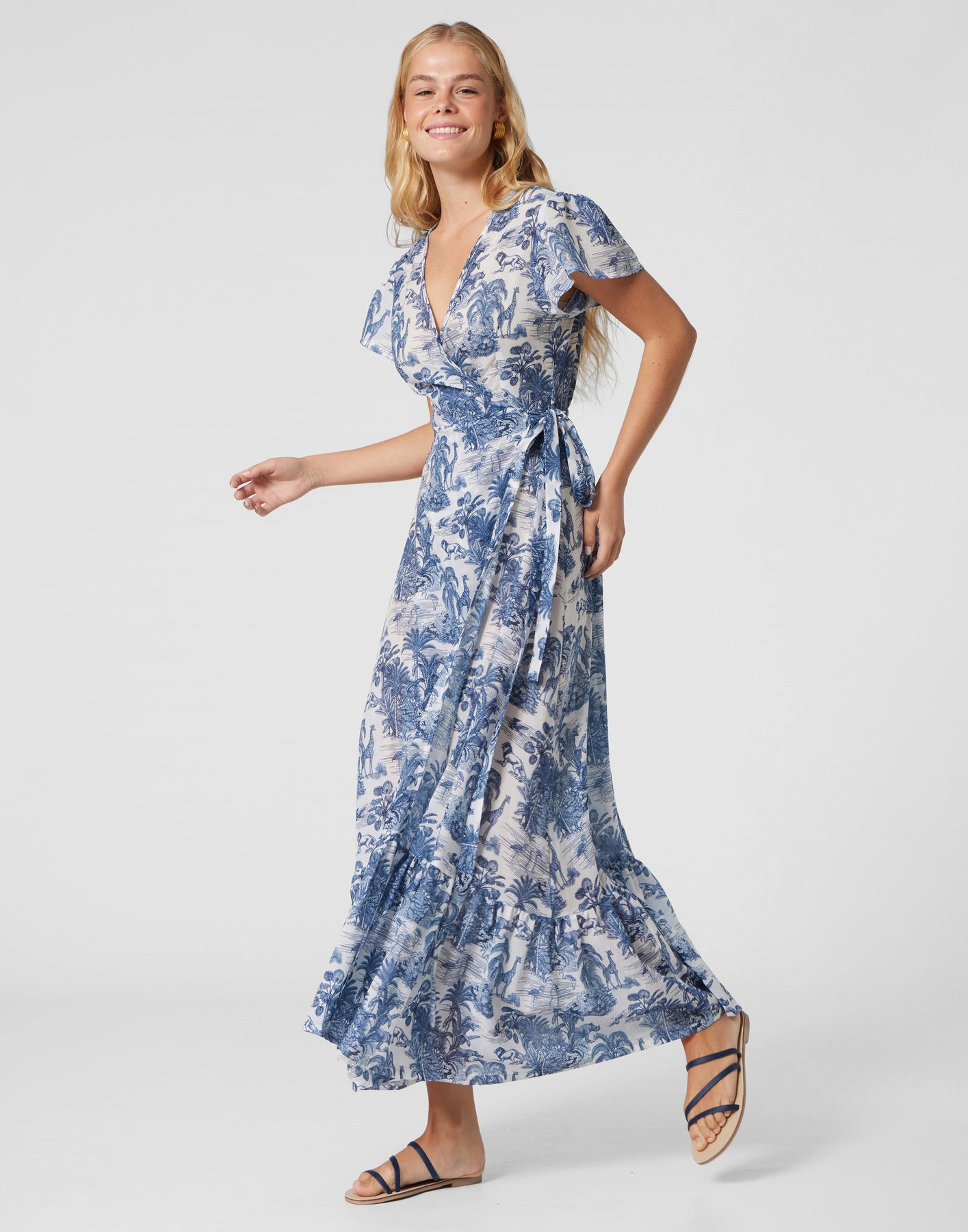 This elegant wrap dress features a stunning blue jungle print that adds a fresh, summery touch to your wardrobe. Designed with a flattering V-neckline and adjustable waist tie, it enhances the silhouette while offering a comfortable, personalized fit. The flutter sleeves and flowy maxi skirt create beautiful movement, making it perfect for daytime outings, beachside strolls, or relaxed evening looks. Crafted from lightweight, breathable fabric, this dress combines effortless style with all-day comfort.
