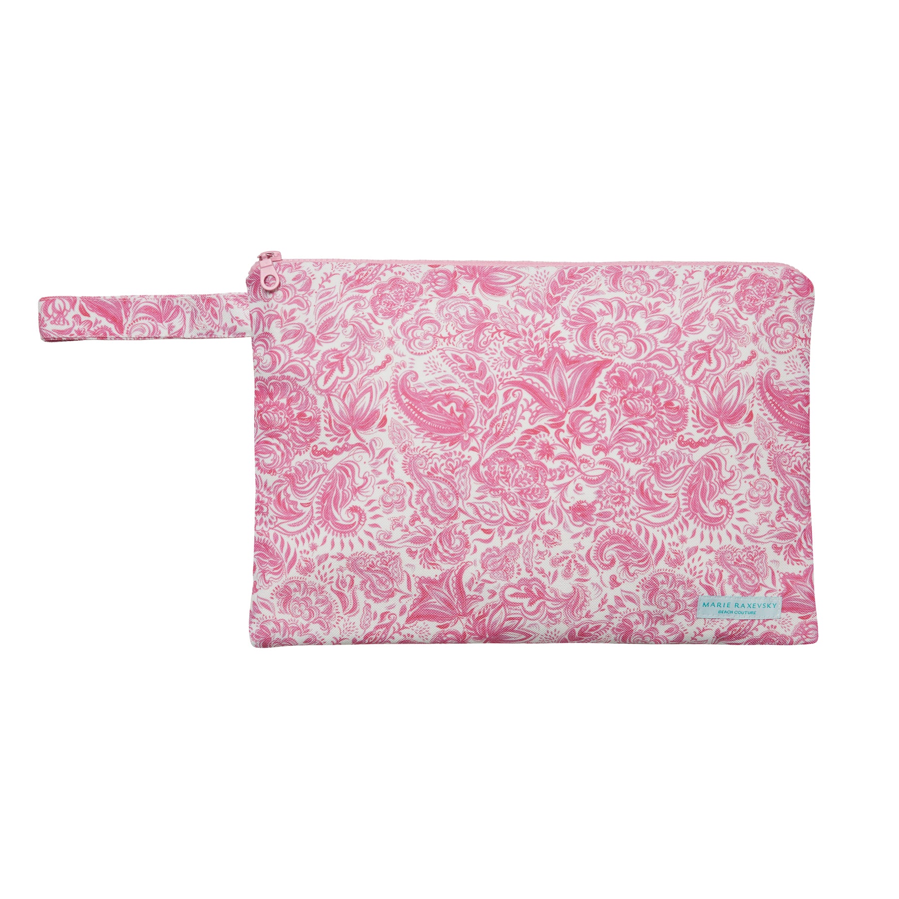 Our collection of waterproof large pouches match our swimwear and beachwear pieces and are the ultimate super stylish summer accessories. Decorated in our signature colorful prints, these pouches are perfect for storing your essentials while at the beach and accessorizing your outfits during sunny morning strolls or island night strolls. This one is decorated in our paisley pink print in, pink hues and features a pink zipper.  Measurements: 25x35 cm.
