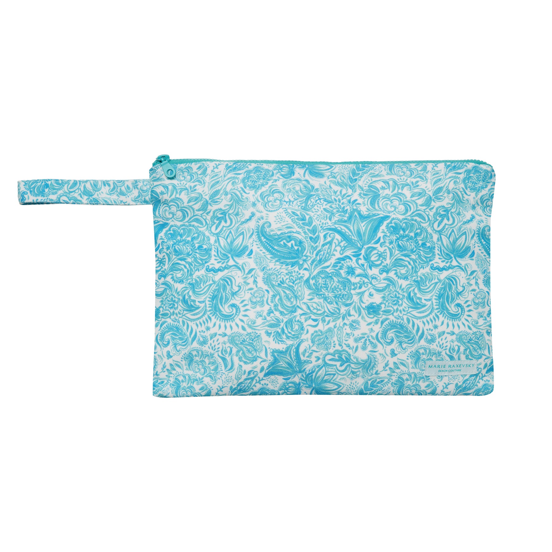 Our collection of waterproof large pouches match our swimwear and beachwear pieces and are the ultimate super stylish summer accessories. Decorated in our signature colorful prints, these pouches are perfect for storing your essentials while at the beach and accessorizing your outfits during sunny morning strolls or island night strolls. This one is decorated in our paisley turquise print in, blue and turquise hues and features a blue zipper. Measurements: 25x35 cm.