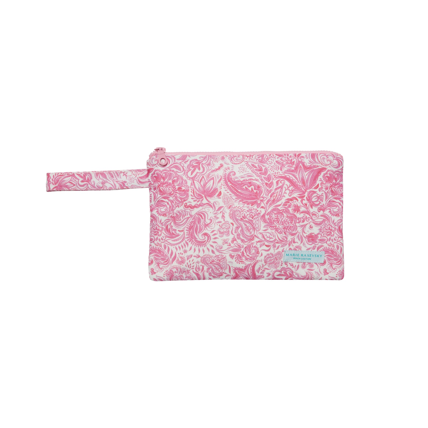 Our collection of waterproof small pouches match our swimwear and beachwear pieces and are the ultimate super stylish summer accessories. Decorated in our signature colorful prints, these pouches are perfect for storing your essentials while at the beach and accessorizing your outfits during sunny morning strolls or island night strolls. This one is decorated in our paisley pink print, in pinkish hues and features a purple zipper. Measurements: 18x25 cm.