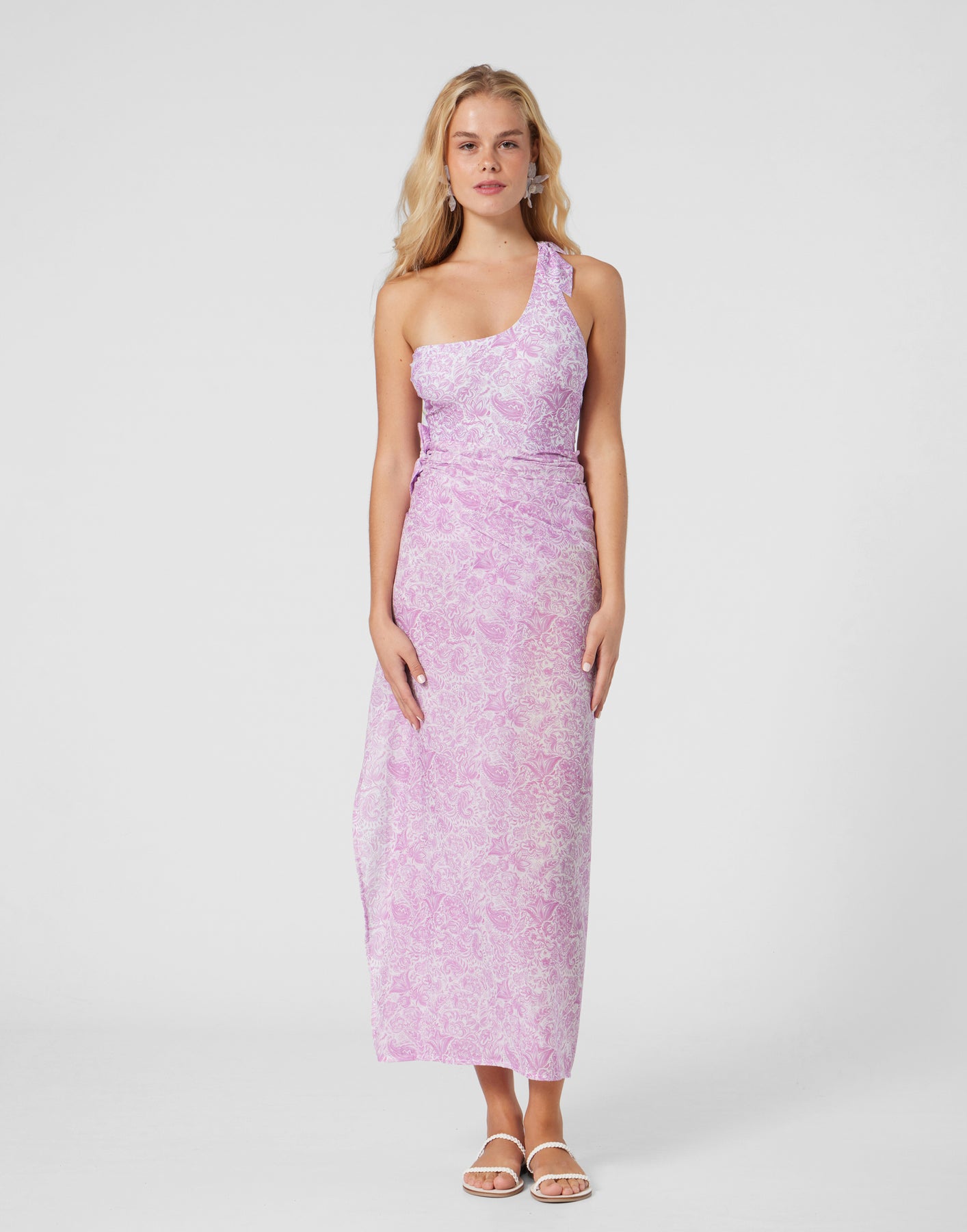 Elevate your beachwear style with this elegant printed pareo Designed in a soft lilac shade with a delicate paisley pattern, it offers a refined and feminine look. The lightweight, semi-sheer fabric drapes beautifully over the body, making it perfect for wearing over your swimwear. Featuring a one-shoulder tie detail, this pareo adds a unique touch to your summer outfits while providing comfort and effortless sophistication. Ideal for beach days, poolside lounging, or resort vacations.