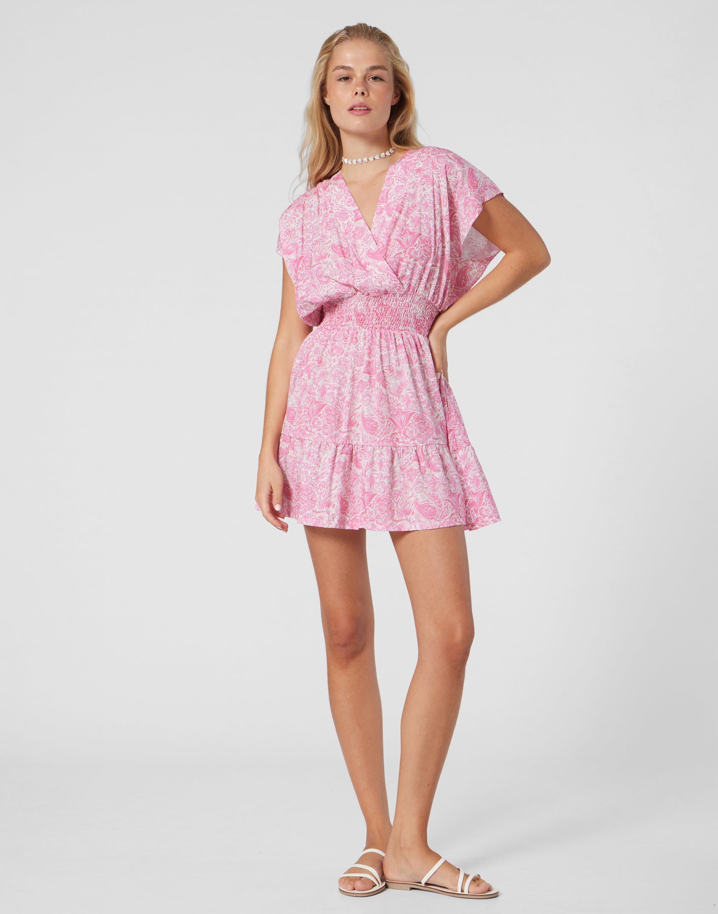 This feminine mini dress features a soft paisley pink print and a flattering wrap style neckline. The wide smocked waistband enhances the shape while ensuring a comfortable fit, and the tiered skirt adds playful movement. Made from lightweight, breathable fabric, it’s perfect for warm days, summer outings, or vacations. Elegant, easy to wear, and effortlessly stylish.