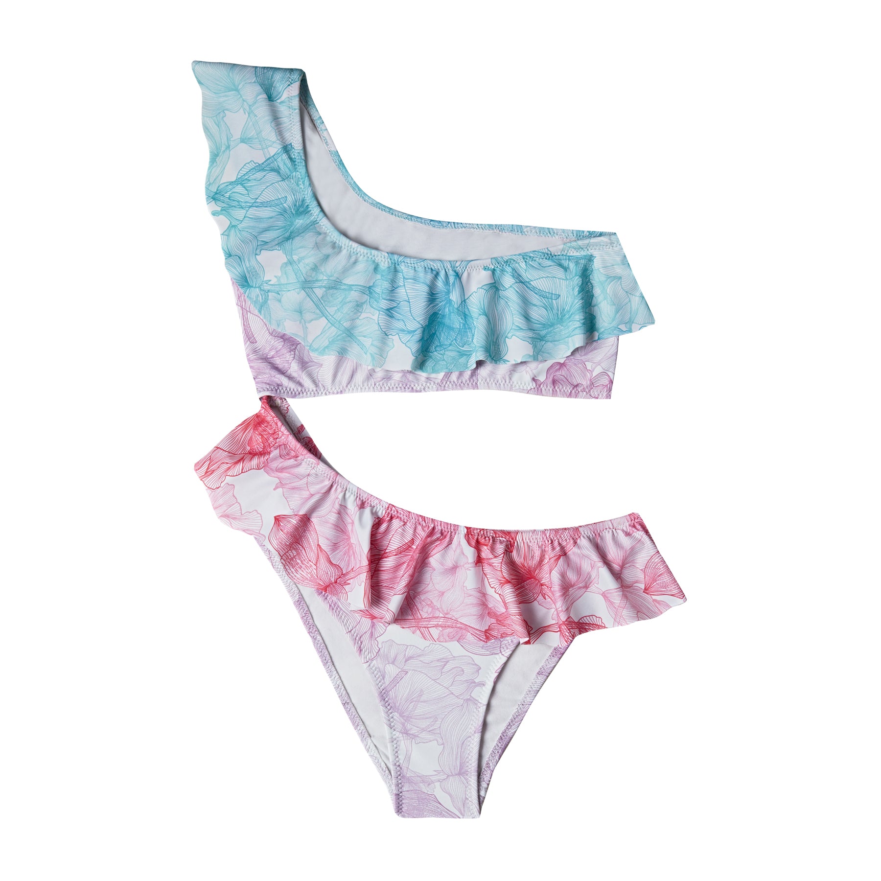 The romantic mixed floral color combo on this one-shoulder one-piece womens swimsuit, featuring an impressive cut-out design detail, with ruffles on the bottom and on the front, creates a sweet rainbow effect, and even resembles to cotton candy on a sunny summer day, as it combines pink, lilac and mint hues. With UPF 50+ sun protection, you will enjoy splish splashing through the waves and…guess what? You can even match with your little girl!