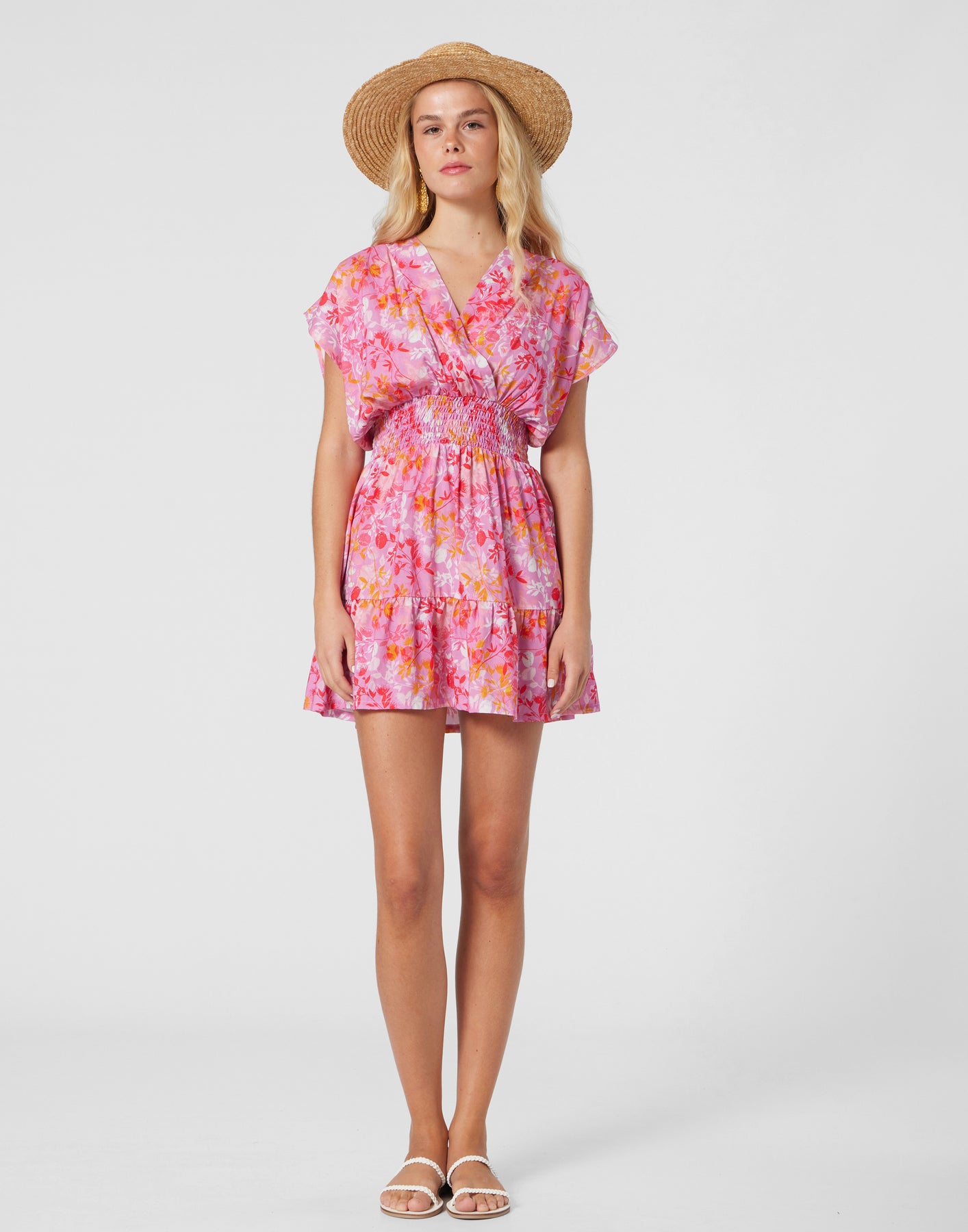 This vibrant pink mini dress brings effortless summer charm to any look. Designed with a flattering smocked waist, it offers a comfortable, figure-enhancing fit. The lightweight fabric and flowy short sleeves add movement and breathability, while the botanical lillac print creates a fresh, playful aesthetic. Perfect for warm days, vacations, or casual outings, this dress pairs beautifully with sandals and a sun hat for a relaxed, feminine style.
