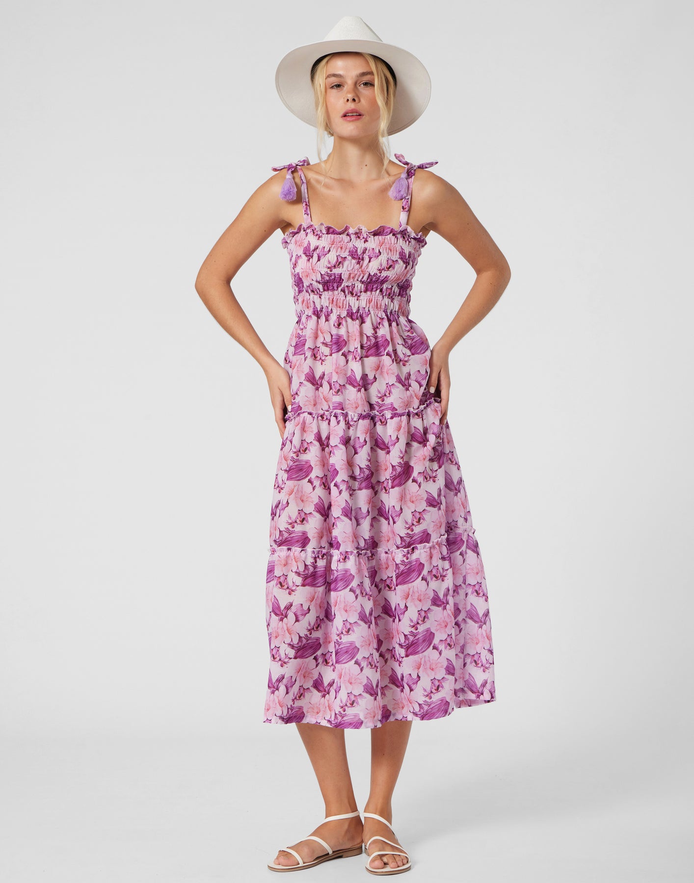 This beautiful flowers midi dress features a smocked bodice for a flattering, comfortable fit and adjustable tie straps adorned with delicate bows. Designed in soft shades of pink and purple, it offers a romantic, feminine look perfect for summer days, vacations, or casual outings. The tiered skirt adds gentle volume and movement, making it an easy and stylish choice for warm-weather dressing.