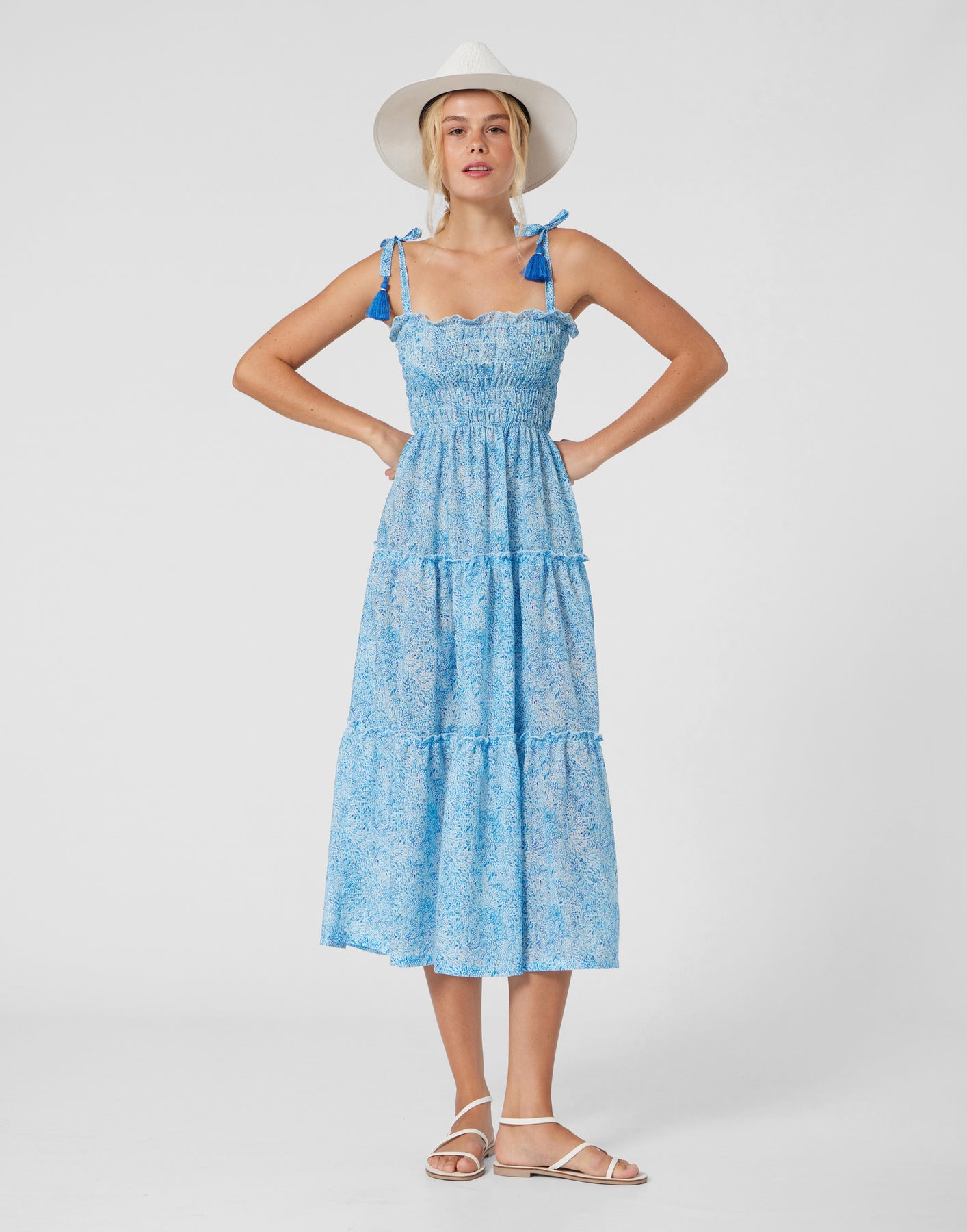 This beautiful midi sundress features a light blue iris print and a fully smocked bodice for a comfortable, flattering fit. The adjustable tie straps with tassel details add a playful, summery touch, while the tiered skirt creates effortless movement. Made from a lightweight, breathable fabric, it’s the perfect dress for warm days, vacations, or casual outings. Stylish, feminine, and easy to wear a must-have summer staple.