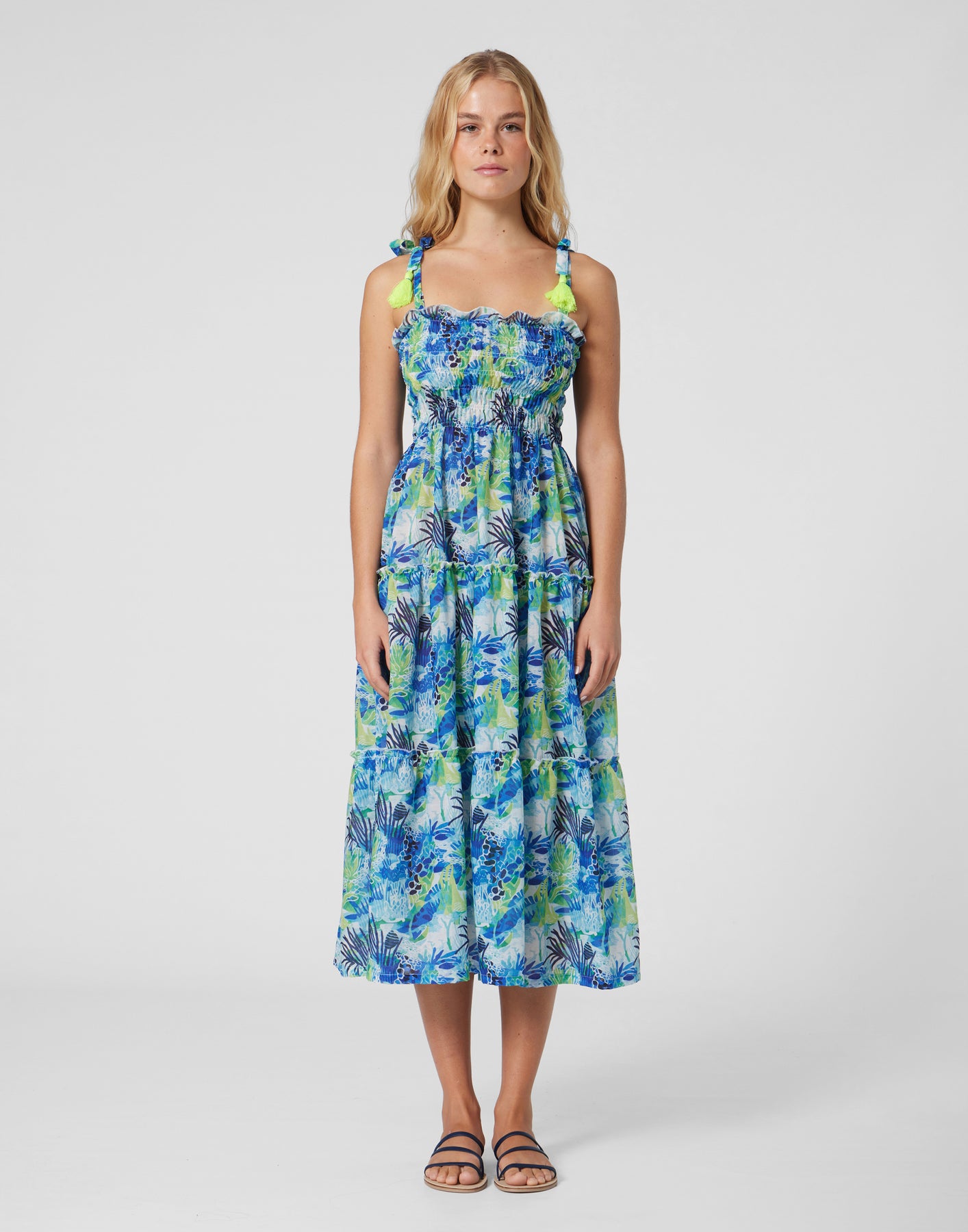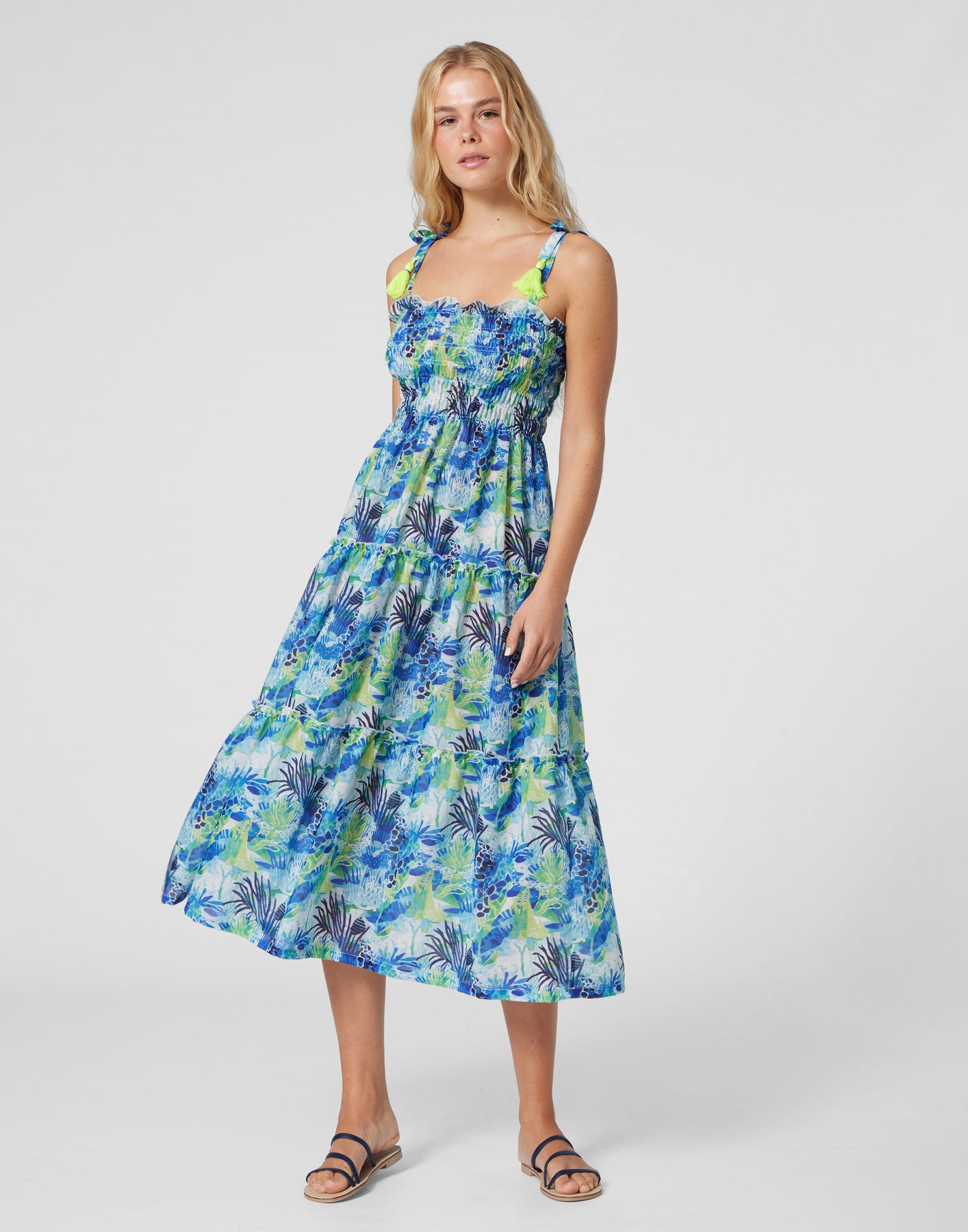 Featuring a lively blue and green aquatic print, it’s designed with a smocked bodice that offers a comfortable, flattering fit. The adjustable tie shoulder straps with playful neon tassels add a fun and feminine touch. Made from a lightweight, breathable fabric, this dress flows beautifully and moves effortlessly with every step. Ideal for beach days, holidays, or warm weather outings, it combines comfort with eye catching style.
